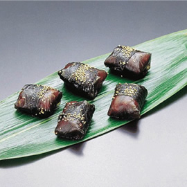ケシの実で和えたピーナッツを、しその葉で巻いて味噌味に仕立てました。味付けはコクのある味噌味です。
