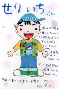 <作者コメント> だいちゃんは、中央卸売市場の仕事やその活躍ぶりを日本中の人に知らしめるために日々頑張っています。中央卸売市場の「おろし」という言葉と「大根」を掛け合わせてキャラクターを考えました。背中に背負っているのは「おろしがね」です。 ★肥後 ゆう子 さん 作 |