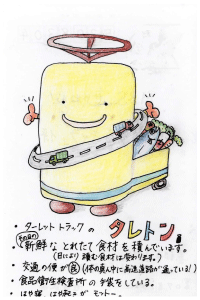 <作者コメント> いつも、市場に新鮮な魚介や野菜を運んでいる。市場が大好きなトラックが市場ではどんなものが売られているのか、品物はどんな風に運ばれくるのか、市場の人たちはどんな風に働いているのか、皆に知ってもらいたいと毎日考えているうちにある朝、いつものように目覚めたら、自由に動けるようなゆるキャラになってた、という感じです。 主体となるのはトラックです。帽子と長靴は市場で働く仲買人の方々を参考にkしました。帽子に書いてある数字は「20」は中央を意味しています。腕についているのは、玉ねぎです。眉毛は「貝」、鼻は「人参」でできています。トラックの荷台には、新鮮な魚介、野菜、くだものが満載です。 ★山本 春江 さん 作 |